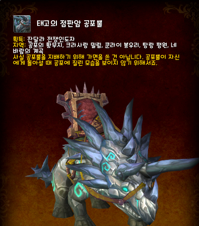 잔달라 전쟁인도자가 탈것을 드랍할 때 타고 있는 공포뿔 색상의 탈것을 드랍한다.